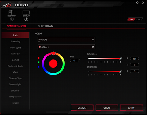 Aura Sync: 可让您开启或关闭 Aura Sync 功能,该功能可在所有支持的装置上同步 Aura Sync 灯光效果。