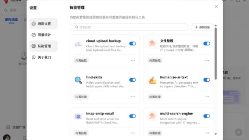 2、技能市场一键集成:Skills市场的设计直观易用,用户可像在应用商店一样浏览、搜索需要的技能,并实现一键安装与启用。这种模块化的方式让AI助手的能力可以轻松自定义和强化。