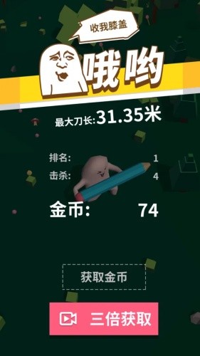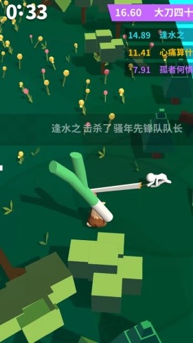 对于游戏玩法来说,还是比较简单休闲的,开局一把刀,后期也不一定是刀,有斧头、大棒等等都有可能,在这个局限的世界中不断的进行劈砍,无论是砍树还是砍人都能够增加你刀的长度,其中砍人会增加的比较多,砍树比较少,在2分之内,没有阵亡的玩家谁刀更长谁胜利。