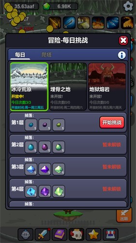 3、冒险玩法,冒险分每日挑战,爬塔两种,通过冒险可以获得各种资源和丰富的宝石。