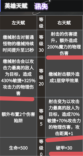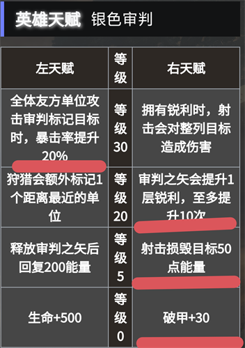 5级天赋选:释放审判之矢后回复200能量。30级天赋:拥有锐利时,射击会对整列目标造成伤害。