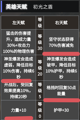 30级伤害减免是必点的,才能抗住伤害。副本开荒一般带她一个肉就够了。格挡回能量可以配合能量套打眩晕控制链。