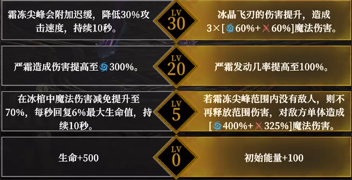 30级:霜冻尖峰会附加迟缓,降低30%攻击速度,持续10秒。